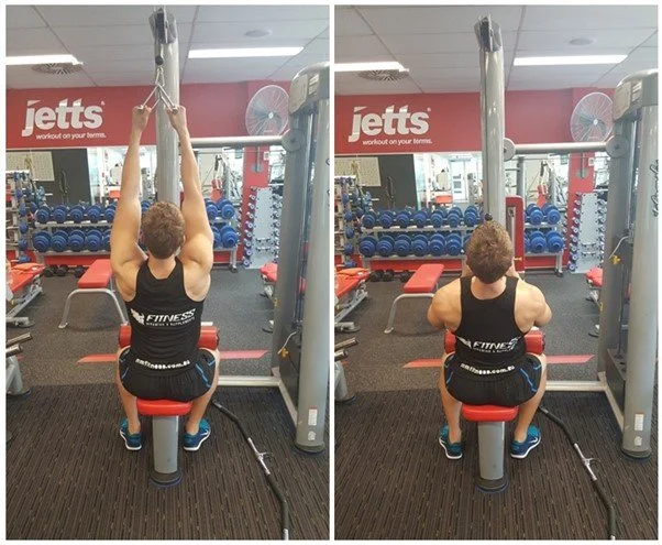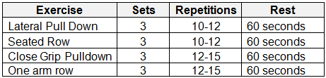 Note: For experienced trainers weighted, body weight or assisted chin ups can be substituted for lateral pull downs.